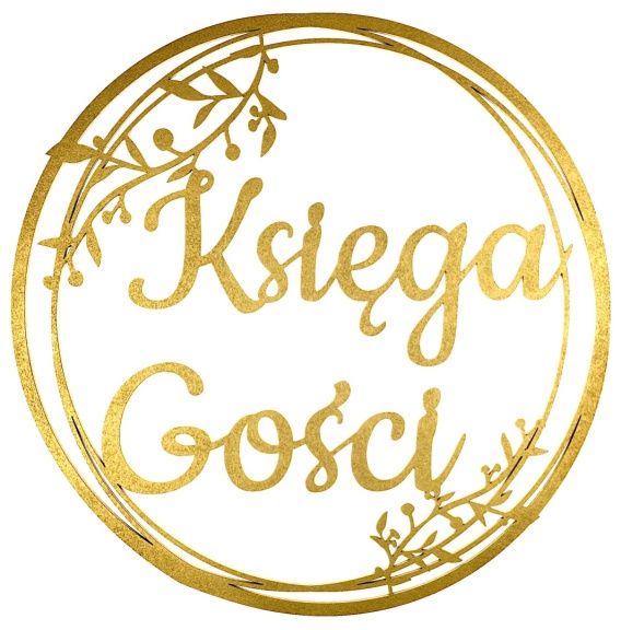 Złota obręcz z napisem Księga Gości o średnicy 30 cm. Wycięta z HDF, idealna do dekoracji strefy pamiątkowych wpisów.