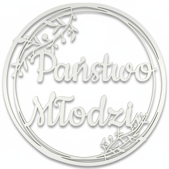 Klasyczna, biała obręcz 40 cm z napisem Państwo Młodzi. Wycięta laserowo z HDF, idealna do romantycznych i tradycyjnych dekoracji.