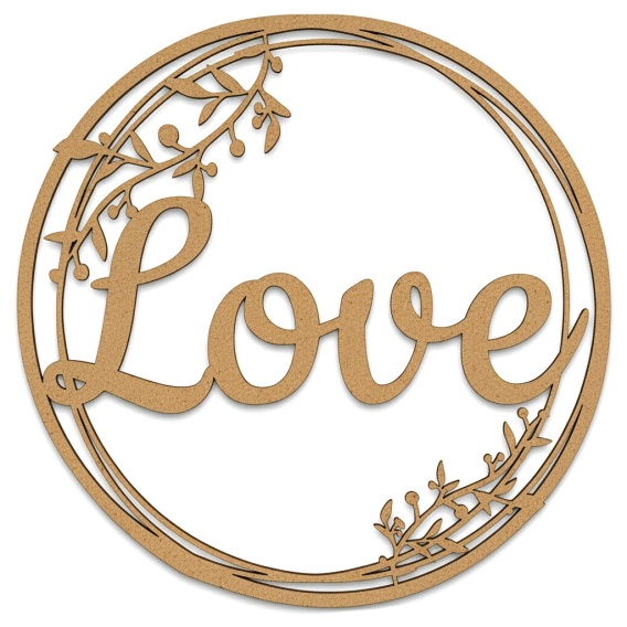 Obręcz 30 cm z surowego HDF z napisem Love. Perfekcyjna do własnoręcznego malowania i ozdabiania na wesele.