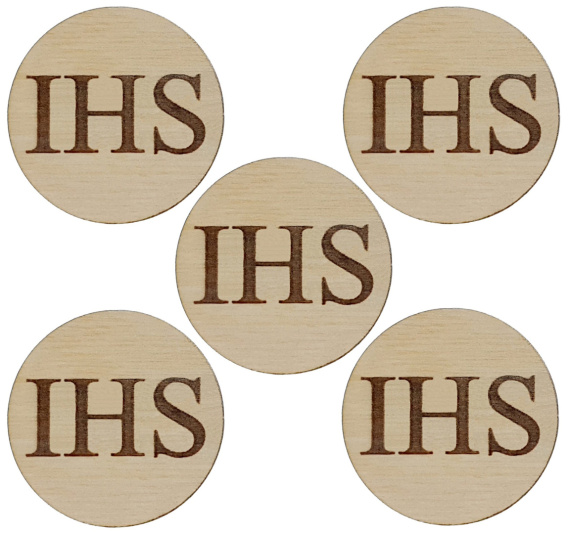 Dekoracyjne hostie IHS drewniane ze sklejki wycięte laserowo. Średnica 3,5 cm, zestaw 5 szt. Idealny dodatek do pamiątek i dekoracji na Pierwszą Komunię Świętą.